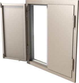 • со стеклопакетом. Металлоконструкция «2 в 1» со встроенным окном и закрывающим его стальным листом.